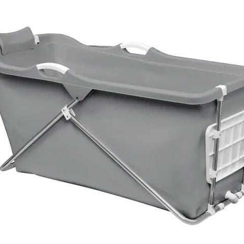 Hopfällbart badkar i plast, längd ca 148 cm, i blå och vit färg. Badkaret har benstativ och kan användas både av vuxna och barn enligt bilderna. Utrustat med lock/överdel som kan skjutas åt sidan, huvudkudde/öppning för huvudet samt sidofack för tillbehör. Konstruktionen är anpassad för att kunna fällas ihop för enklare förvaring när det inte används. Lämpligt för inomhusbruk i badrum eller utomhus på altan/uteplats enligt exempelbilderna.