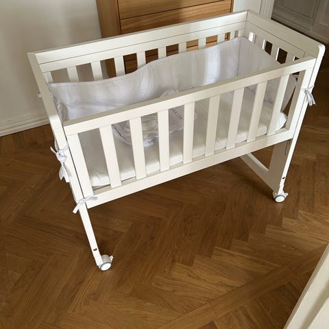 Stilren och smart Bedside Oslo från Troll Nursey som kan användas både som fristående säng eller ställas mot en större säng så man kan ligga nära barnet på natten. Sängen är tillverkad av björk och har en sängbotten som är ställbar i tio olika lägen (bäddhöjd 59 cm - 74 cm (utan hjul) + 6 cm med hjul.). Långsidan har en dropside funktion och kan fällas till hälften för att matcha vuxensängen.