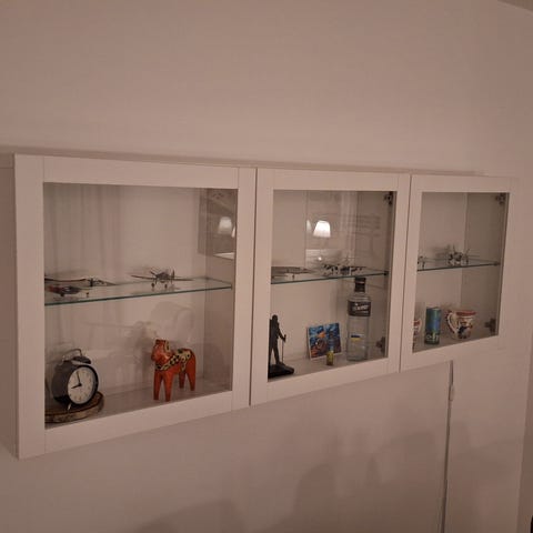 Vit vägghylla med flera rektangulära fack i olika storlekar. Hyllan är avsedd för montering på vägg och passar för förvaring och exponering av till exempel dekorationer, böcker eller mindre föremål i vardagsrum, sovrum eller hall.