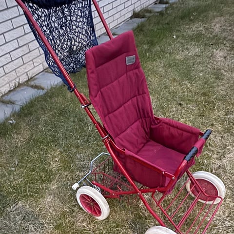 BRIO sittvagn/sulky i grått tyg med mönstrade kanter. Vagnen har fyra hjul, vadderad sittdel med hög rygg och fotstöd.