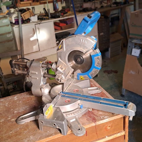 Kap- och gersåg med blått handtag och motorhus. Sågen är eldriven med nätkabel och har en cirkelsågklinga monterad. Maskinen är avsedd för kapning och geringssågning av trä och liknande material. Monterad på en basplatta med graderad skala för inställning av kap- och geringsvinklar. Passar för olika typer av snickeri- och byggarbeten där raka och vinklade snitt behövs. Kling skydd i underkant saknas.