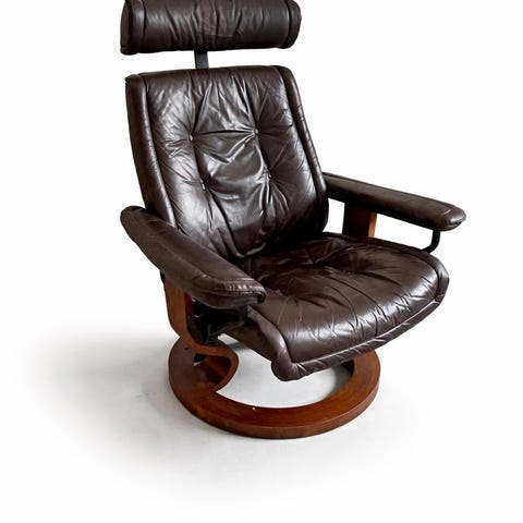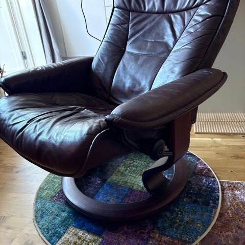 Stressless fåtölj med fotpall tillverkad av Ekornes. Textilklädd i kraftig original tyg i plommon/lila färg.