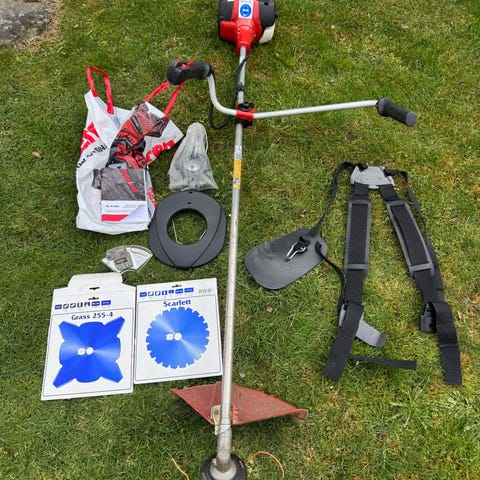 Garden BC430A röjsåg för trimning och röjning av gräs och sly. Bensindriven modell med tvåtaktsmotor. Utrustad med bärsele och handtag för bättre kontroll vid arbete (handtaget har knäck på en av sidorna). Grön kåpa och skydd över klipphuvudet. Passar för underhåll av trädgård, tomt och mindre marker där man behöver komma åt där gräsklippare inte räcker till.