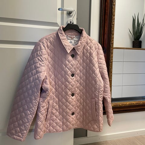 Tommy Hilfiger quiltad damjacka i storlek S/M. Jackan är grön och tillverkad i polyester. Modellen har krage, tryckknappar framtill och två större fickor. Ärmen har ett rundat märke med Tommy Hilfiger-logotyp. Baksidan är quiltad i samma mönster och kragen har randig detalj. Passar som ytterjacka under svalare väder.