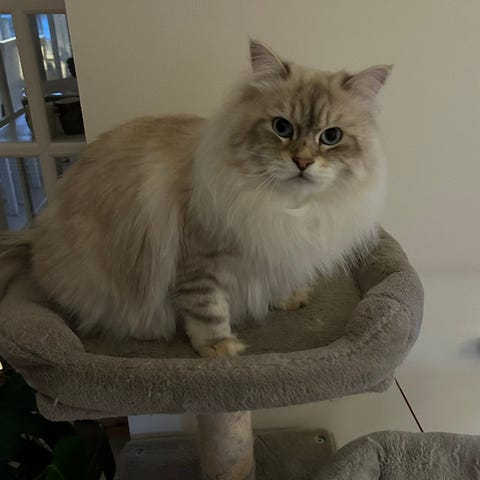 Kattställning med flera nivåer och klöspelare i beige textil, inklusive hängande boll-leksak. Separat fristående klöspelare på brun bottenplatta. Medföljer även en sluten kattlåda i plast i röd och vit färg med bärhandtag på ovansidan. Passar för inomhusbruk till katt.