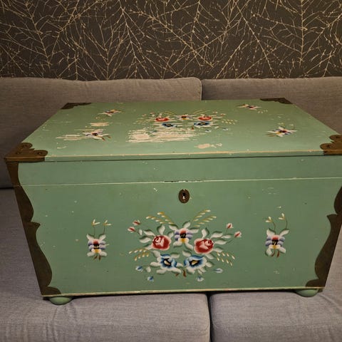 Dekorativt målad byrå från 1944. Två lådor inuti. Låset funkar, en nyckel medföljer.