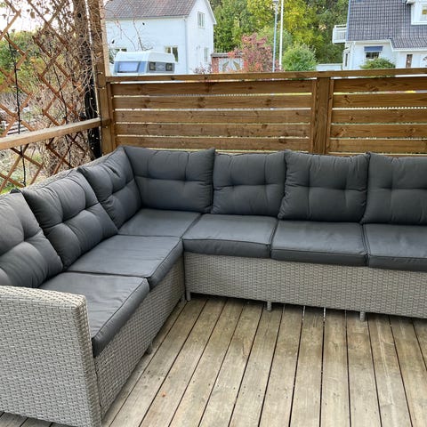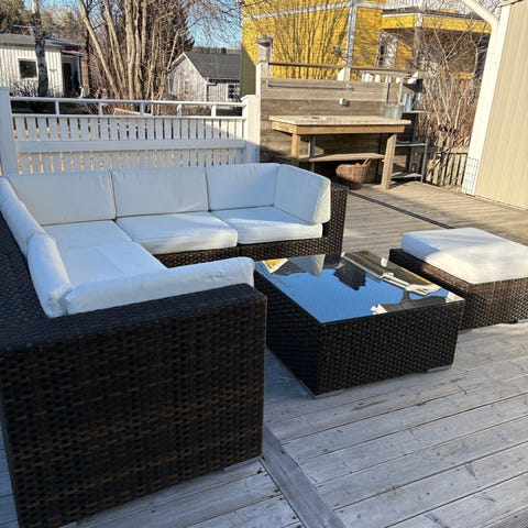 Utemöbel 2. Hörnsoffa med bor ( inkl glasskiva.) fina dynor ingår. Möblerna är tre år och från EM möbler.