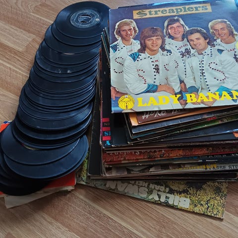 Ca 300 skivor i varierat skick. Blandade genrer. 4st i princip fulla backar, varav de tre backarna på bilderna ingår.
