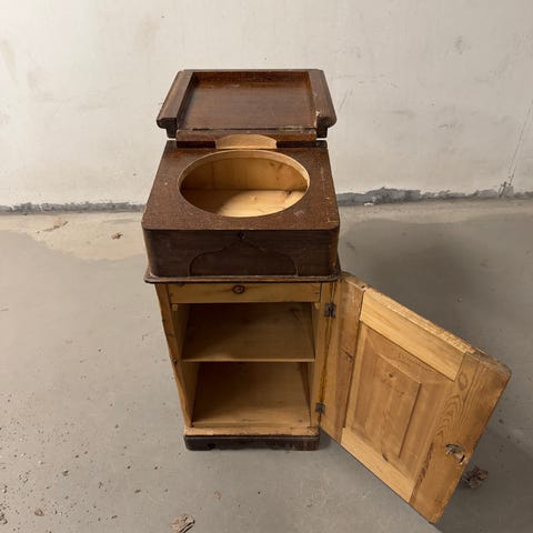 Skåp i trä med vitmålad stomme och naturfärgad, sliten träskiva upptill. Skåpet har en utdragslåda överst och ett skåp med en dörr nedtill. Invändigt är skåpet i trä med enkel förvaring. Passar exempelvis som sidobord, sängbord eller förvaringsmöbel i hall, vardagsrum eller sovrum. Mått enligt bilder med tumstock (höjd och bredd/djup) framgår av fotona.