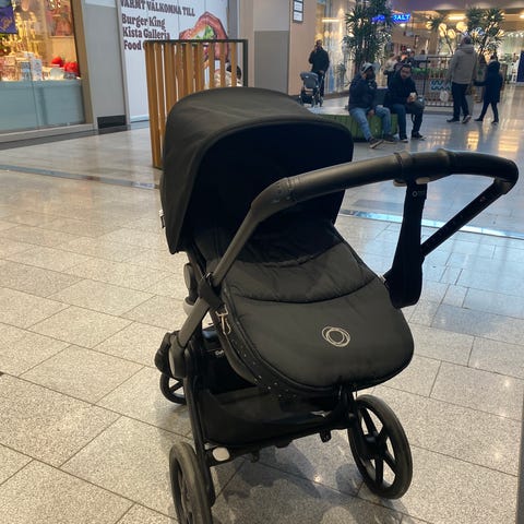 Bugaboo sittvagn med svart chassi och svart sittdel. Vagnen har en ljus sufflett och bygel framtill. Utrustad med sele i sittdelen samt varukorg under vagnen. Passar för ett barn och är lämplig för vardagsbruk, promenader och resor i stadsmiljö.
