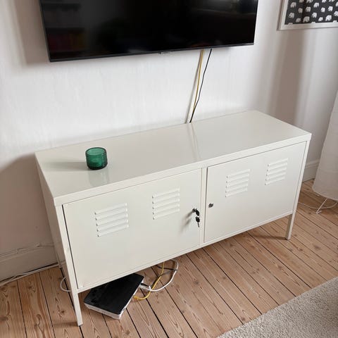 Vitt skåp ”PS” från IKEA i industriell stil. Vi har haft den som TV-bänk men den passar också som förvaring i andra rum. Mycket gott skick, som ny! Inköpt förra året. Nypris 899 kr. Säljes för 100 kr för att vi vill bli av med den snabbt.