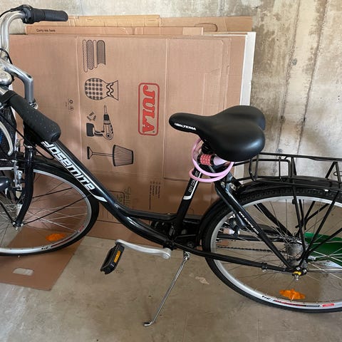Dubbla korgar, litet blocklås följer med. 7 växlar och fotbroms. Navgenerator på framhjulet som driver lyset