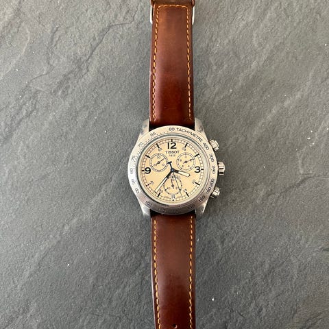 Citizen herrklocka med kronograf och analog urtavla. Klockan har ljus urtavla med tydliga siffror och subdials för tidtagning. Boetten är rund med metallfinish och har tryckknappar för kronograffunktionerna. Klockan är utrustad med brun läderrem med ljusa sömmar och klassiskt spänne. Passar för herr och är avsedd att bäras som armbandsur till vardag eller mer uppklädda tillfällen.