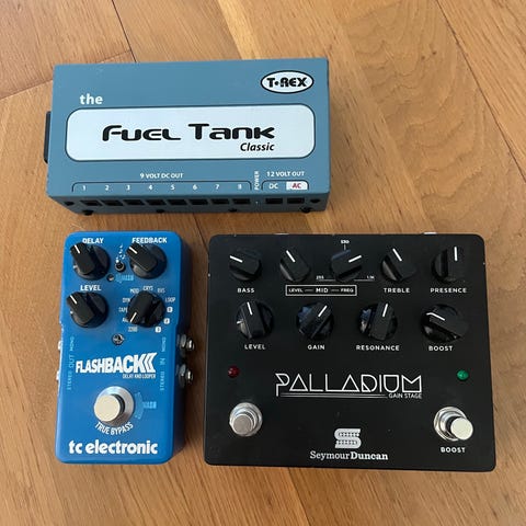 Med 10 pedalkablar och nätsladd.