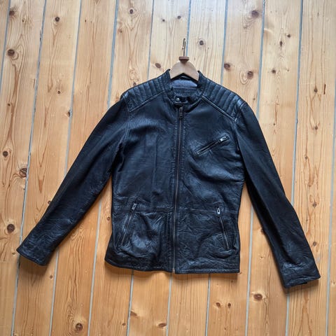 Jack & Jones jacka för herr i storlek L. Jackan är svart och tillverkad i läder. Modellen har dragkedja framtill, ståkrage med knapp och flera fickor med dragkedja. Passar som ytterjacka i vardagen eller till enklare utebruk.