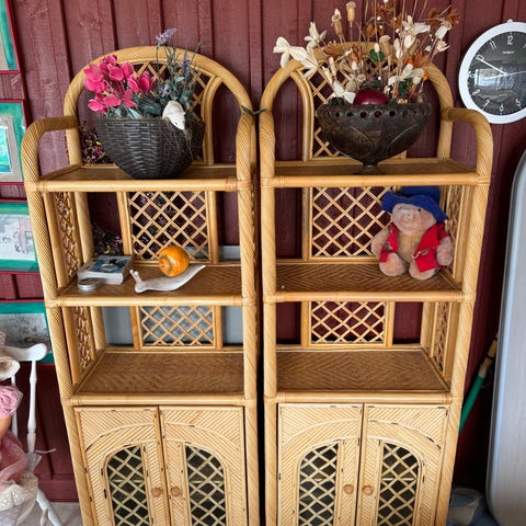 Hörnhylla i brunlaserat trä med tre hyllplan. Öppen design med ribbade hyllplan och dekorativa detaljer i ryggstycket. Passar att ställa i ett hörn i exempelvis balkong, vardagsrum eller hall för förvaring eller dekoration.