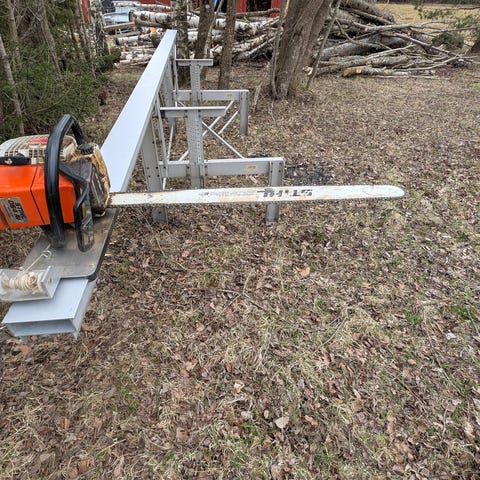 Orginal. Nästa nytt 4 år, 25 timmar drifttid. Har byggt timmerhuset/bastu klart. 14hk bensinmotor. 2 st förlängningar max 7 meter såglängd. Vändhake, remsats i reserv. Överdrag. 11 sågblad varav 5 oanvända. Finns några mil norr Örebro. Har stått under tak alla år. Nypris 66836:-