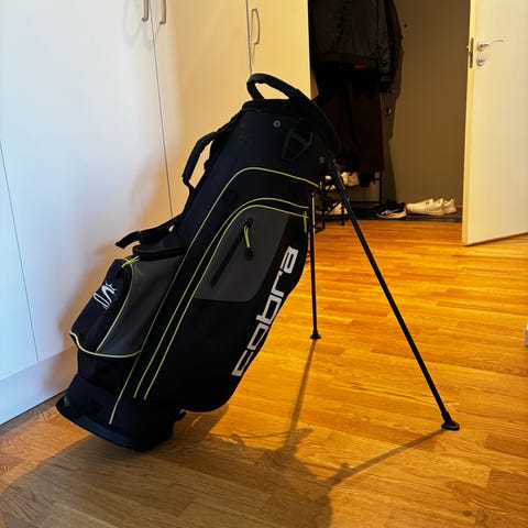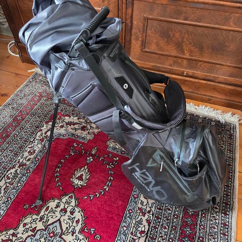 Sun Mountain H2NO bag i svart, vattentät och 5 st fickor varav en är ett kylfack. Den är delar i 14 fack för klubborna perfekt en för varje klubba så då inte slår i varandra. Går att bära som en ryggsäck och jag ben som fälls ut så den kan stå stadigt på marken.