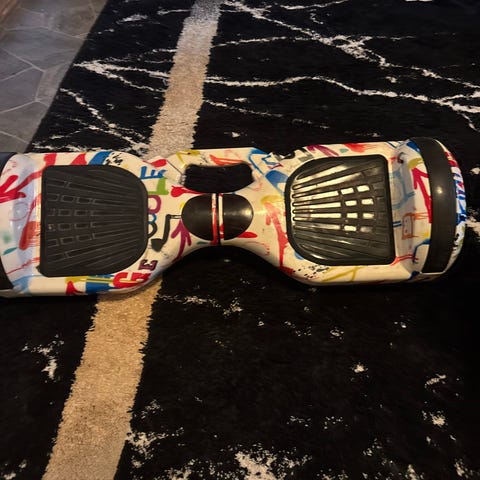 Hoverboard gokart-säte med ram och styrhandtag. Sätet är i plast med låg sittposition och monterat på en metallram. Framtill finns ett litet svängbart hjul och två styrhandtag med grepp. Konstruktionen är avsedd att fästas på ett hoverboard för att kunna köra det sittande som en gokart-liknande vagn. Passar för användning på plana, hårda underlag som asfalt eller stenlagd yta.