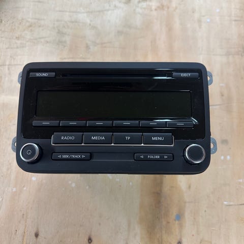 Volkswagen original bilstereo radioenhet för montering i bilens mittkonsol. Enheten har inbyggd radio och mediefunktioner med knappar för RADIO, MEDIA, TP och MENU samt volym- och inställningsreglage på frontpanelen. Passar utvalda Volkswagen-modeller med samma typ av infästning och anslutningar. Lämplig som ersättningsenhet vid defekt eller byte av befintlig originalstereo.