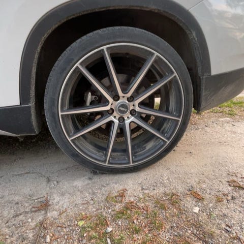Två fälgar har skador, men har två nya, men däcken sitter på dom skadade,