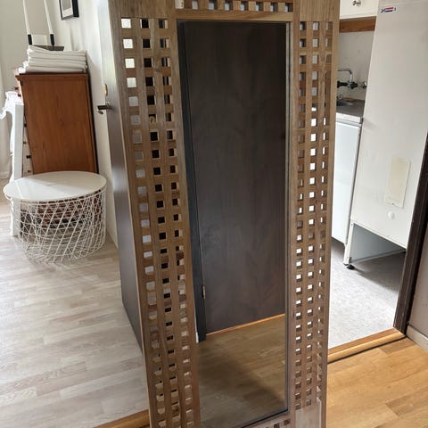IKEA spegel med vit, rektangulär ram. Spegeln har en bred, profilerad träram i vitt och är avsedd för väggmontering eller för att ställas mot vägg. Passar i exempelvis hall, sovrum eller vardagsrum som helkroppsspegel eller större väggspegel. Mått enligt bilder med måttband (ungefärliga).