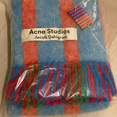 Grön/vit randig pläd från byon samt grön klippan premium i merinoull och lammull som nya båda två. Endast legat som dekoration på soffan.