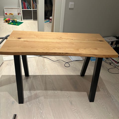 Vi säljer vårt Jysk skrivbord i svart färg med tunn metallstomme och rak, rektangulär bordsskiva. Bordet har en enkel, öppen konstruktion med en låg kant/list längst bak som kan fungera som avskiljare eller stöd för mindre föremål. Passar som arbetsbord eller datorbord i hemmakontor, sovrum eller vardagsrum. Materialet framstår som metallstomme med skiva i träbaserat material med mörk yta.