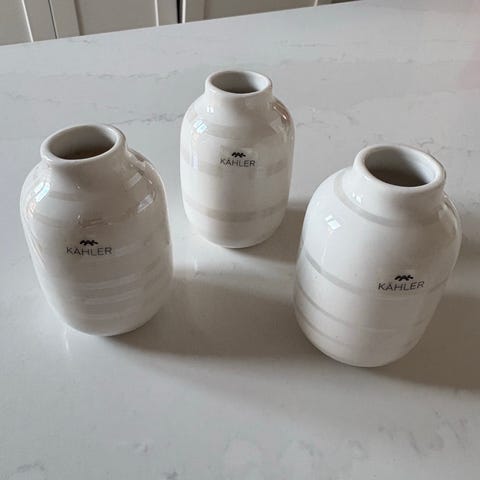 Kähler vaser i vit keramik. Setet består av fyra vaser i olika höjder och former, lämpliga för snittblommor eller som dekoration. Passar att placera tillsammans som grupp eller var för sig på bord, hylla eller fönsterbräda.