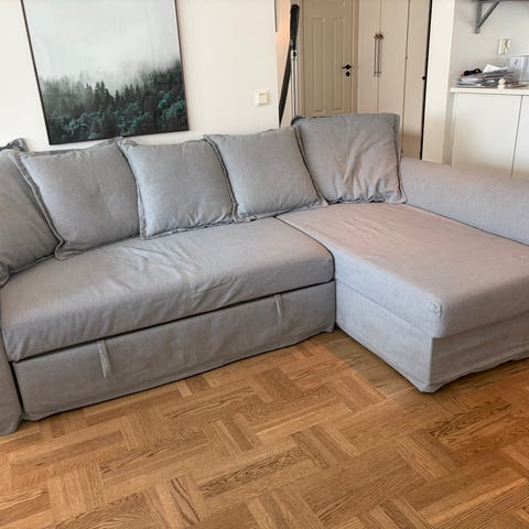 Bäddsoffa från IKEA. Förvaring under schäslongen och utdragbar del för att göra soffan till en dubbelsäng. Rosa överdrag. Något solblekt, finns fläckar på sitsen.