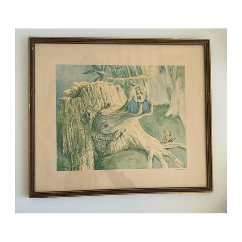 Charmig tavla med tryckt motiv av den älskade barnsagan ”Håvtrollet" av E. Norelius. Bilden visar ett troll med ett fiskenät vid en bäck, med ett svamphus i bakgrunden och feer samt insekter i luften. Signerad "E. Norelius -52" och märkt "KONST OCH KULTUR AB" samt "Wezäta". 43x37 cm. Begagnat skick.
