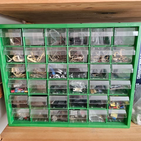 Elektroniskt experimentbord byggsats med olika moduler och komponenter för elektronikexperiment. Panel med flera kontakter, reglage, högtalare, brytare och mätfunktioner. Lämplig för grundläggande experiment inom elektronik och kretsuppbyggnad. Märkningar och kopplingsschema finns tryckta på ovansidan för att underlätta anslutningar och övningar.