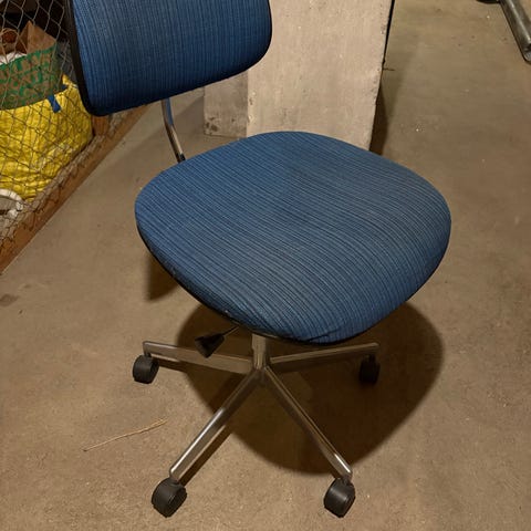 Säljer en stilren och smidig kontorsstol i blått jeans-tyg. Perfekt för skrivbordet, hemmakontoret eller som extra stol. Enkel design utan armstöd gör att den passar bra även i mindre utrymmen.