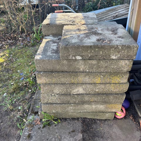 Takpannor i betong i grå/grön nyans. Pannorna är staplade utomhus och lämpar sig för exempelvis takläggning, reparation eller utbyte av befintligt tak. Antal pannor och exakta mått kan kontrolleras vid intresse. Bortskänkes mot avhämtning GRATIS