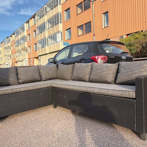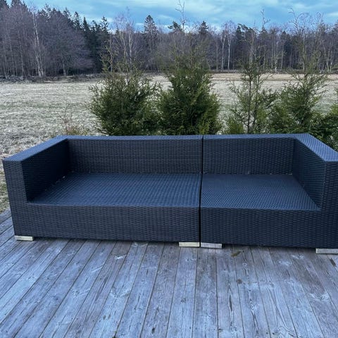 Hörsoffa för utomhusbruk i konstrotting med grå dynor. Soffan består av flera moduler som kan ställas ihop till en längre hörnsoffa. Till soffan hör även en fotpall med dyna samt ett soffbord med glasskiva. Passar för placering på balkong, altan eller uteplats. Dynorna är tjocka och avtagbara. Möbeln är avsedd för flera sittplatser och ger en loungeliknande sittgrupp för utomhusmiljöer.