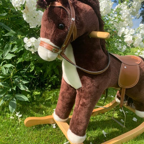 Kroppen är klädd i mjuk plysch i beige och vitt med brunt träns och sadel. Underredet är i trä med medar och fotstöd. Passar som leksak för barn att sitta och gunga på inomhus.