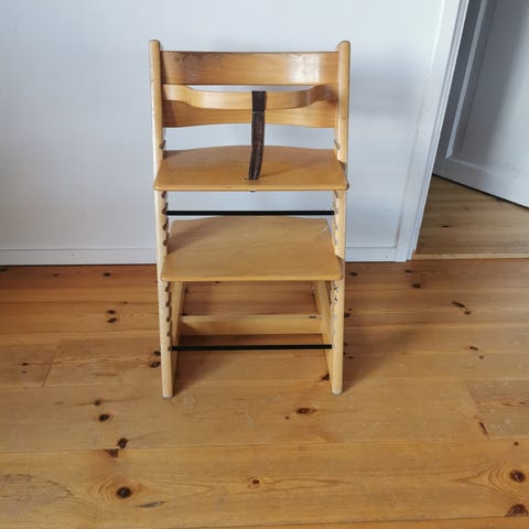 Stokke Tripp Trapp barnstol i svart trä. Justerbar sittyta och fotstöd som kan anpassas efter barnets längd. Klassisk trappstolsmodell som ger barnet möjlighet att sitta vid bordet i rätt höjd. Passar från små barn till större barn beroende på hur stolen ställs in. Mest sliten vid delen mot golvet samt vid någon där del sittdelen eller fotdelen ställts in. Helhetsintryck helt ok.
