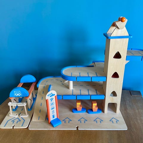 Trevåningsgarage i välanvänt skick. Hissen går upp och ner när man vrider på knappen.