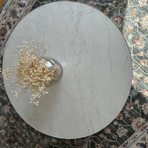 Runt soffbord i glas och metall. Bordet har två runda glasskivor, en övre bordsskiva och en nedre hylla för extra avlastningsyta. Stommen är i metall med en blank, ljus finish. Passar som soffbord i vardagsrum eller loungeyta.