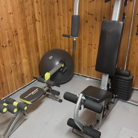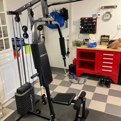 Multigym träningsstation med viktmagasin för inomhusbruk. Utrustningen har sittdel med ryggstöd, arm- och benstöd samt flera handtag och dragstationer för olika styrkeövningar. Konstruktionen är i metall med vadderade dynor. Passar för styrketräning av över- och underkropp i hemmagym eller mindre träningslokal.