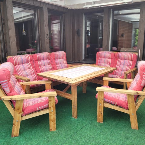 Soffgrupp för utomhusbruk bestående av en 3-sits soffa och en fåtölj. Möbelram i mörklackerad metall med raka ben och rundade armstöd. Sits- och ryggdynor i grå textil. Passar på balkong, altan eller uteplats som sittgrupp för flera personer. Bordet kan ingå om man så vill. Möblerna har endast stått inomhus. Finns i Västerås. 2 500 kronor.
