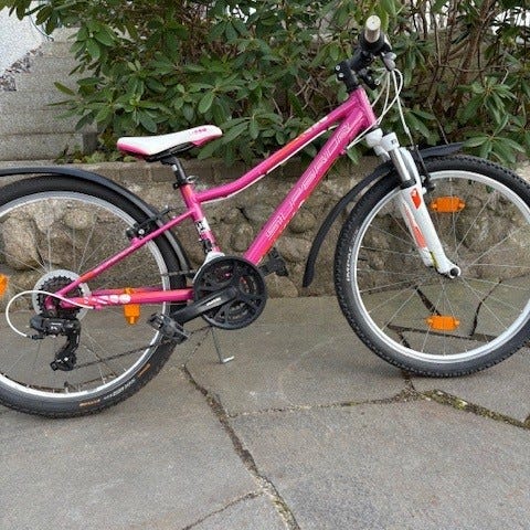 Scott barncykel med 24" hjul i svart utförande med gula detaljer. Cykeln har rak styre, handbromsar och 21 växlar som manövreras från styret. Cykeln är välanvänd. En lite skada på sadeln men inget som påverkar funktionen.