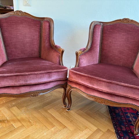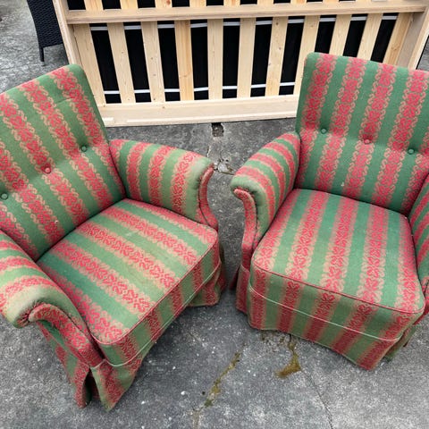 Två stycken balustrad-fåtöljer i grönt tyg. Varmsamt använda. 500kr per fåtölj. Hämtas på Värmdö.