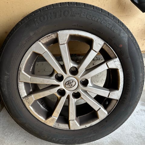 Två uppsättningar fälgar med däck som suttit på Hilux.