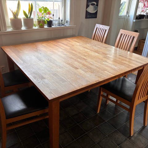 Mio matgrupp bestående av matbord och stolar. Bordsskivan är i trä med naturlig träfärg och underrede i vitt. Stolarna har sits i trä med samma träfärg som bordsskivan och vit stomme med ribbad rygg. Passar som matplats i kök eller vardagsrum. Exakta mått och modellnamn är inte angivna.