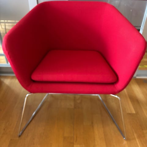 Italiensk designstol av Lievore Altherr Molina för Arper. Modell Catifa 53 med helklädd sits i rött tyg, randig sömnad, kromad trestle-bas. Märkt "arper, made in Italy". Avtagbart tygöverdrag med dragkedja.