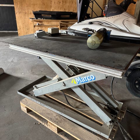 Biltemas Hydrauliskt motorcykellyft / lyftbord med angiven kapacitet på 680 kg. Konstruktion i metall med blå lackering och svarta halkskydd på ovansidan av lyftytorna. Utrustad med hydraulcylinder för höjning och sänkning samt hjul baktill för enklare förflyttning. Avsedd för lyft och service av motorcyklar, fyrhjulingar eller liknande fordon inom angiven maxvikt. Hämtas i Lerdalatrakt utanför Skövde.