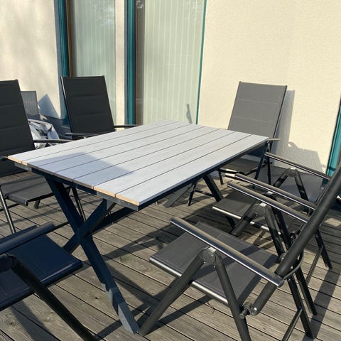 Matgrupp för utomhusbruk bestående av ett rektangulärt bord och sex stolar. Bordsskiva i gråa ribbor och ben/stomme i ljus metall. Stolarna har matchande grå sits och rygg med metallstomme. Passar för placering på altan, uteplats eller trädgård för gemensamma måltider och samvaro utomhus.