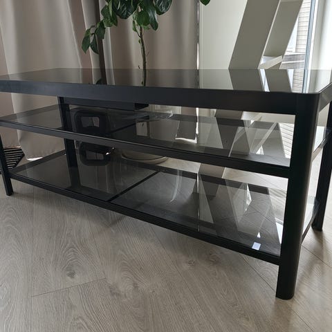 Tv-bänk med rektangulär marmorskiva i ljus färg med marmorering. Underrede i svart metall med öppna sidor. Bänken har en hylla i tonat glas under bordsskivan som ger extra förvaringsyta för till exempel mediautrustning eller dekoration. Passar som tv-möbel eller låg förvaringsbänk i vardagsrum eller liknande utrymme.