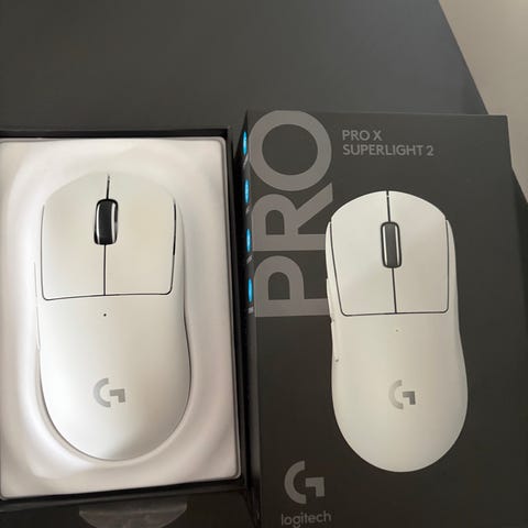 Logitech G Pro X Superlight 2 SE datormus i svart färg. Trådlös gamingmus med USB-mottagare och medföljande USB-kabel för laddning och anslutning. Levereras med originalförpackning och dokumentation enligt bild.
